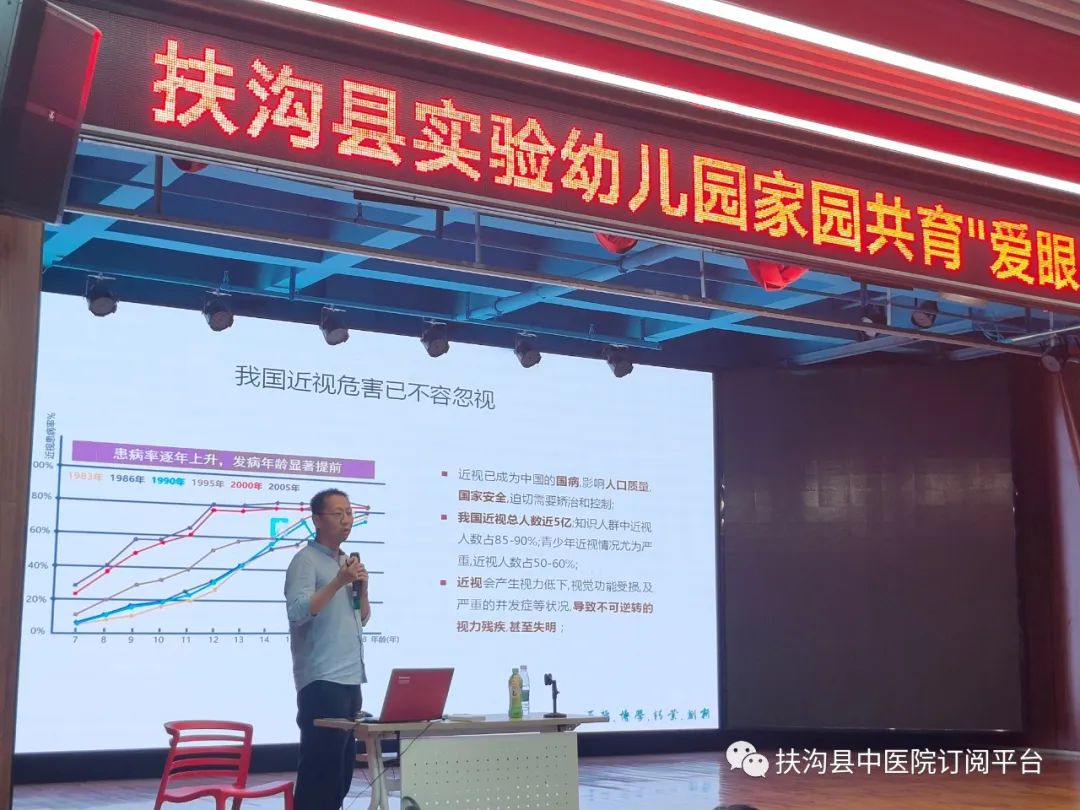 为进一步增强儿童青少年爱眼护眼意识,帮助学生养成良好的用眼习惯,做好校园近视防控防护,提升家长科学防控理念,6月15日下午,扶沟县第二医疗健康服务集团县中医院眼科联合郑州大学第一附属医院小儿眼科,携手扶沟县实验幼儿园共同开展了“爱眼护眼”科普知识讲座。扶沟县中医院眼科主任李春杰、健康促进部主任何秋蕾及健康宣讲团队、郑州大学第一附属医院眼科专家荣军博教授、200余名家长代表及学校卫生保健人员参加了此次活动。讲座现场,李春杰主任、荣军博教授用通俗易懂、生动活泼的语言,给老师及家长们上了一堂与众不同、别开生面的爱眼护眼健康知识讲座。从近视的概念、成因、家庭中如何防控及科学的防控方法等方面为家长们进行了详细讲解。家长们对此次讲座反映良好,讲座结束后,积极与医院专家们沟通交流,二位专家针对家长关切的儿童青少年近视的问题,一一给家长们做出解答,同时从学生、家长两个层面分享了爱眼护眼小知识。荣教授强调:“后天环境是近视形成与发展的主要原因,近距离阅读、读写姿势不正确、长时间观看电子屏幕等因素都有可能造成近视度数持续增长,日常生活和学习中,一定要养成良好的用眼习惯。”李主任说:“希望通过这次讲座,让老师和家长们知道近视的危害和如何正确预防近视。儿童青少年近视防控,是一项需要全社会参与、全方位防控的长期系统工程,扶沟县中医院通过举办多元化的眼健康教育活动和科普宣教活动,向全社会普及近视防控知识,推进“家校医”联动,筑牢学生视力健康“防线”。